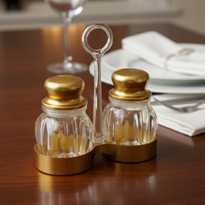 طقم شاكر 02-043 مع حامل يجمع بين العملية والأناقة في تصميم واحد أنيق. مصنوع من أكريليك شفاف فاخر بلمسات ذهبية لامعة، يضفي هذا الطقم لمسة فاخرة على أي غرفة طعام أو مطبخ. الهزازان المزدوجان مثاليان للملح والفلفل أو توابلك المفضلة، بينما يضمن الحامل المطابق بمقبض مركزي سهولة الحمل وعرضًا أنيقًا.