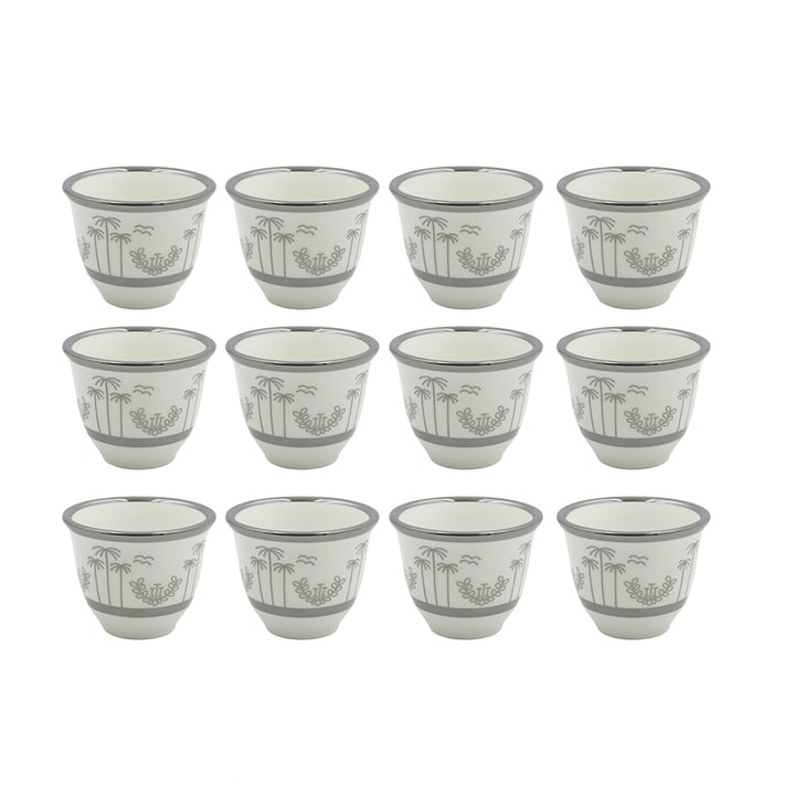 1577S-80CC Cawa Cup Set – 12 Pieces – 80ml White Porcelain with Silver Rim & Palm Design