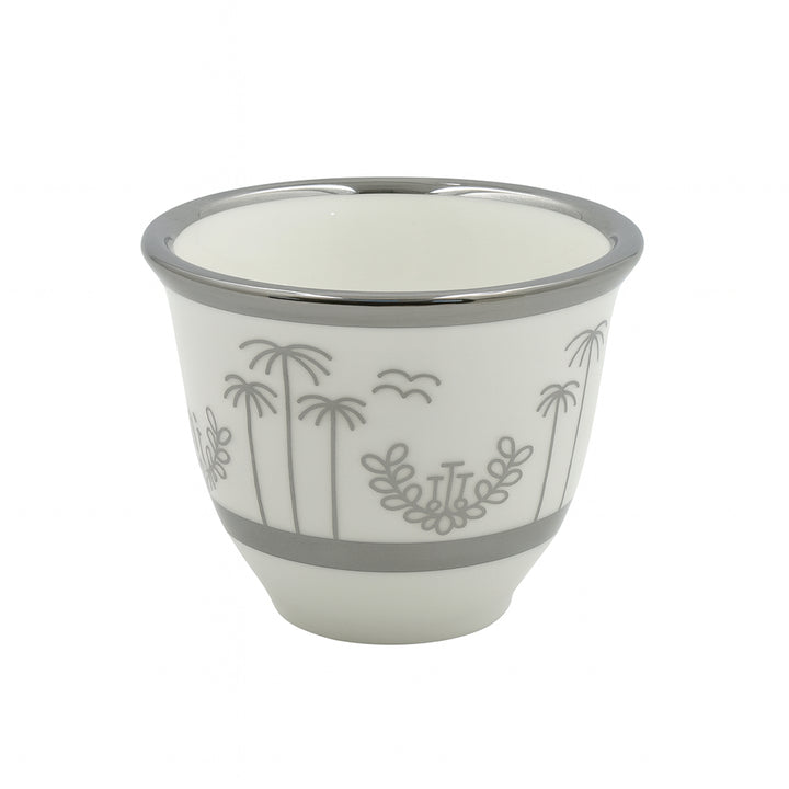 Enhance your coffee rituals with the 1577S-80CC Cawa Cup Set – 12-Piece Elegant Porcelain Set. Designed with a sleek silver rim and subtle palm motif, this set adds a refined and contemporary touch to serving Arabic coffee (Gahwa), Turkish coffee, or espresso.