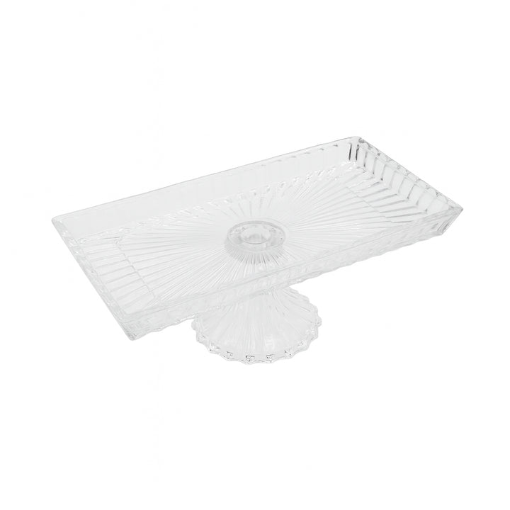 Transform your table into a stylish display with the 1598-3 Glass Fruit Stand – 32cm (L) x 16cm (W) x 12cm (H) Elegant Rectangular Ribbed Pedestal Serving Tray. Featuring a sleek ribbed pattern with a sunburst design and a raised pedestal base, this tray is perfect for serving fruits, cakes, desserts, or party snacks in a sophisticated way.