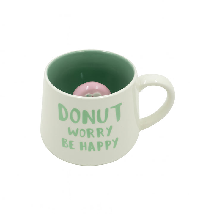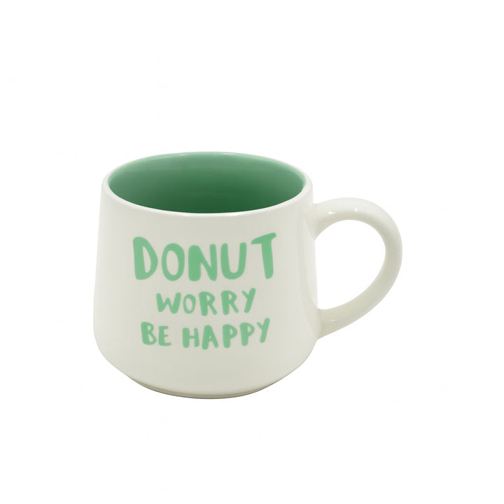 كوب السيراميك 269-14 - تصميم "دونات ووري بي هابي" - دونات من الداخل - أخضر وأبيض، هو كوب مرح ومبهج يُضفي لمسة من المرح على روتينك اليومي مع القهوة أو الشاي. يتميز بسطح خارجي أبيض لامع مع حروف خضراء وداخل أخضر متناسق، ويبرز بشكل دونات سيراميكي ثلاثي الأبعاد مخفي في أسفل الكوب. مصنوع من السيراميك المتين، يجمع هذا الكوب بين الأناقة والعملية، مما يجعله خيارًا ممتازًا للاستخدام الشخصي أو كهدية مميزة.