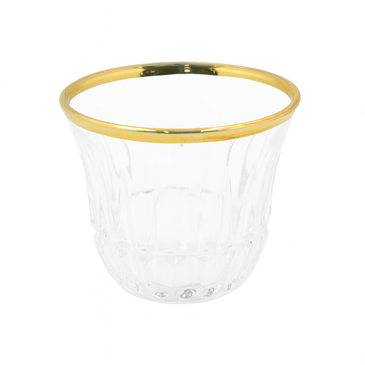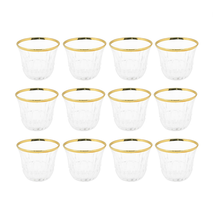 Make every coffee gathering feel special with the 5340372 Gold Line Crystal-Style Cawa Cup Set. Designed with a beautiful faceted pattern and a refined gold rim, these cups bring a perfect blend of elegance and tradition to your table. Crafted from high-quality glass, this 12-piece set is lightweight, durable, and ideal for serving Arabic coffee (Gahwa) or espresso in style – whether for everyday use or special occasions.