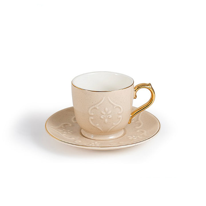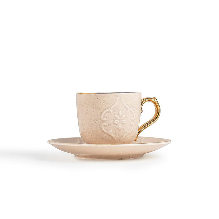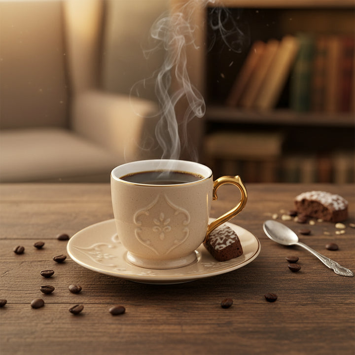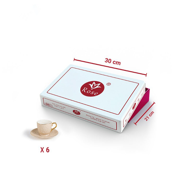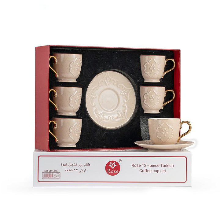 The 624 Rose Turkish Coffee Cup Set – 12-Piece Brown Beige Porcelain Design brings timeless Middle Eastern charm to your coffee moments. Crafted from premium porcelain with delicate embossed floral patterns and luxurious gold-finished handles, this set blends classic artistry with modern elegance. Perfect for serving Turkish or Arabic coffee during gatherings, celebrations, or daily indulgence.