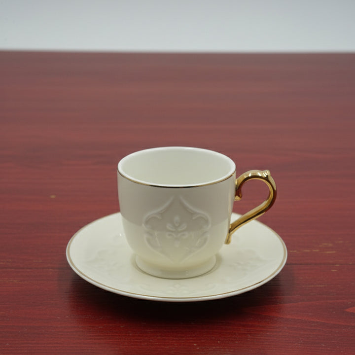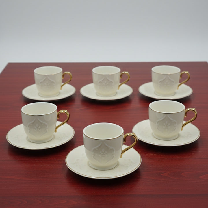 624 Rose Turkish Coffee Cup Set – 12-Piece – Ivory Finish with Embossed Design and Gold Handle