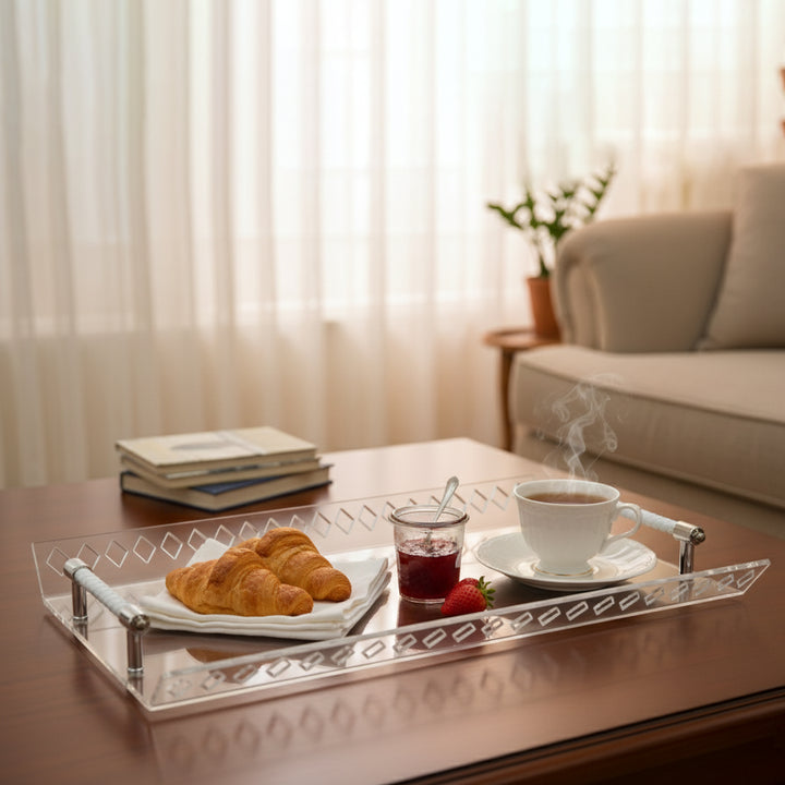 أضف لمسةً من الرقي إلى تجربة تقديمك مع صينية التقديم الأكريليك AT-31046. مصنوعة من أكريليك شفاف عالي الجودة، تجمع هذه الصينية بين الشفافية العصرية والمقابض البيضاء المضفرة الأنيقة لراحةٍ وراحةٍ فائقة. مثالية لتقديم المشروبات والحلويات والوجبات الخفيفة في المنزل أو المكتب أو المناسبات الخاصة.