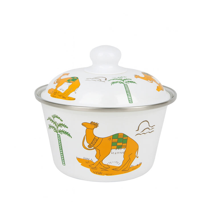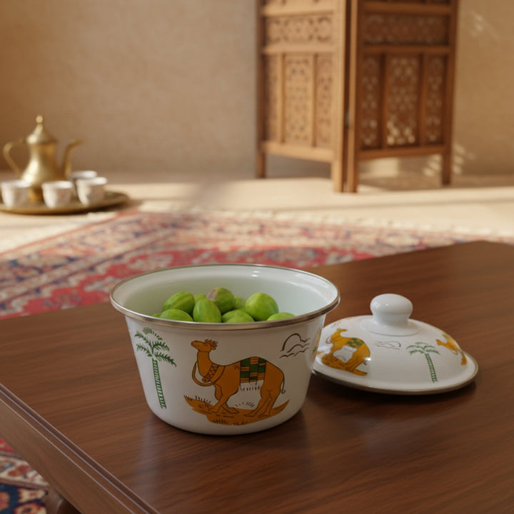 وعاء تقديم CBF20 المينا مع غطاء - 20 سم - بتصميم الجمل والنخيل، يمزج بين سحر الشرق الأوسط التقليدي والعملية العصرية. مصنوع من فولاذ فاخر مطلي بالمينا، هذا الوعاء الواسع مثالي للوجبات العائلية والتجمعات والمناسبات الاحتفالية. يضفي نقش الجمل والنخيل الفني لمسةً ثقافيةً تُضفي لمسةً جماليةً على ديكور مطبخك وطريقة تقديمه على مائدتك.