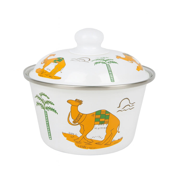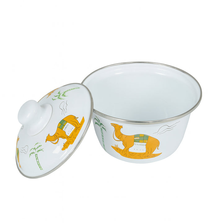 وعاء تقديم CBF24 المينا مع غطاء - 24 سم - بتصميم الجمل والنخيل، يجمع بين الفن العربي الكلاسيكي والاستخدام اليومي العملي. مصنوع من فولاذ عالي الجودة مطلي بالمينا، هذا الوعاء الكبير مثالي للوجبات العائلية، والتجمعات الاحتفالية، وتجهيزات المائدة الأنيقة. يضفي نقش الجمل والنخيل المميز سحرًا صحراويًا دافئًا، مما يجعله إضافة عملية وزخرفية لمجموعة أدوات التقديم الخاصة بك.