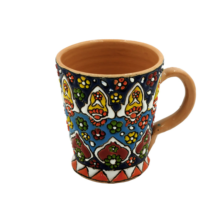 كوب سيراميك يدوي الصنع - كوب مزخرف مرسوم يدويًا بقطر 9 سم، يضفي لمسة فنية تقليدية على لحظات الشاي أو القهوة اليومية. مصنوع يدويًا بمهارة على يد حرفيين مهرة، يتميز هذا الكوب ببطانة داخلية ناعمة من السيراميك الطبيعي، وسطح خارجي مطلي يدويًا بألوان متعددة بزخارف نباتية وهندسية متقنة بدرجات الأزرق والأحمر والأصفر والأخضر. مقبضه المتين ولمسته النهائية اللامعة يضمنان استخدامًا مريحًا ومتانة تدوم طويلًا. مثالي لتقديم المشروبات الساخنة أو كإضافة زخرفية مميزة، فهو مزيج من العملية والحرفية الخالدة.