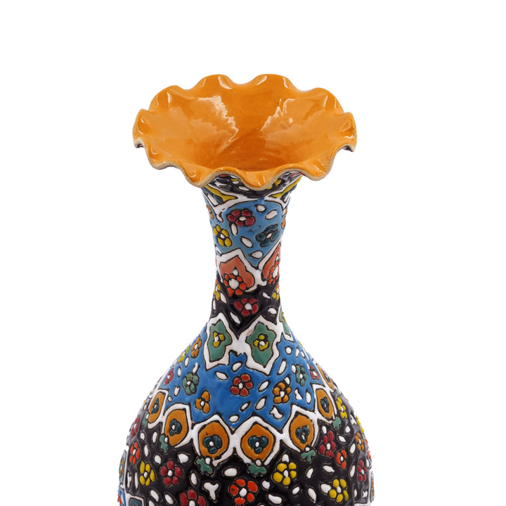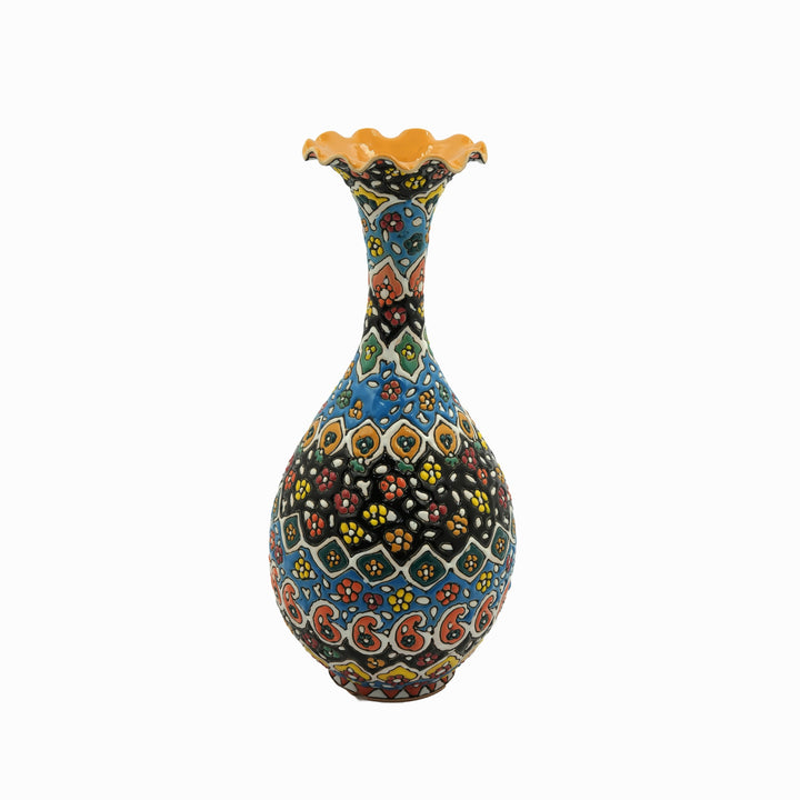 مزهرية زهور خزفية يدوية الصنع - تصميم زهور مزخرف يدوياً، مقاس 36 سم، تُعدّ مثالاً رائعاً على الحرفية والفنون الثقافية. صُنعت هذه المزهرية الطويلة بمهارة على يد حرفيين مهرة، وتتميز بزخارف نباتية وهندسية معقدة مرسومة يدوياً بألوان زاهية متعددة. عنقها الطويل الأنيق وحافتها المتموجة يُضفيان لمسةً راقية، مثالية لإضفاء ارتفاع وأناقة على مساحاتك الداخلية. سواءً عُرضت مع زهور طازجة أو مجففة، أو استُخدمت كقطعة ديكور مستقلة، تُضفي هذه المزهرية لمسةً من التراث الراقي والذوق الفني.
