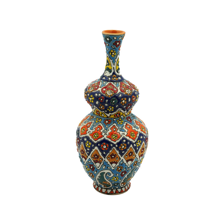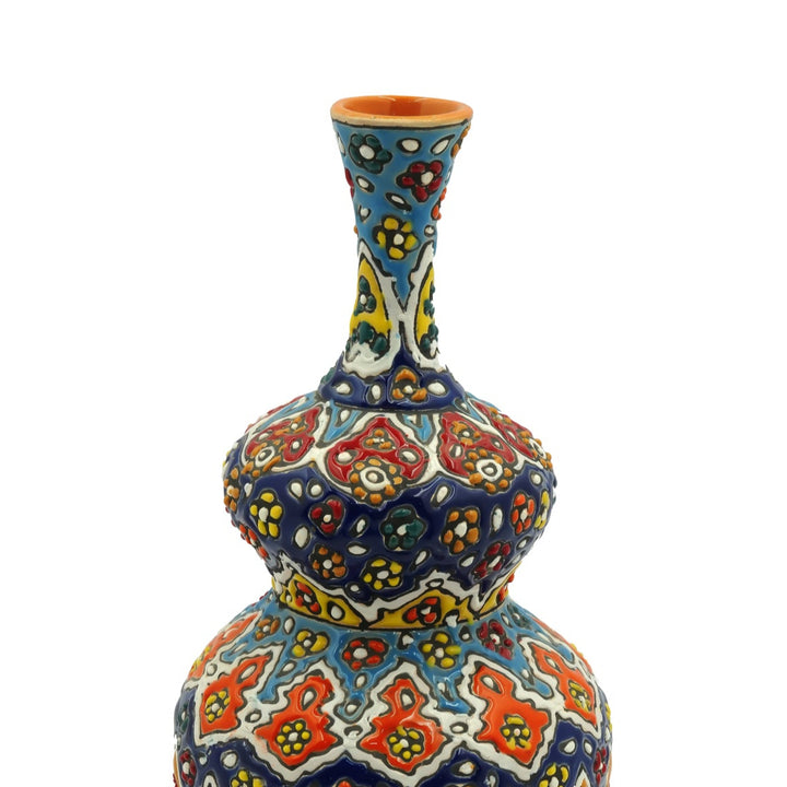 مزهرية زهور خزفية يدوية الصنع S - تصميم زهور مزخرف يدوياً، تُعدّ مثالاً رائعاً على فنّ المنمنمات والحرف الخزفية التقليدية. صُنعت هذه المزهرية الصغيرة بمهارة يدوية على يد حرفيين مهرة، وتتميز بشكلها المنحني المزدوج المميز المزين بزخارف نباتية وهندسية معقدة. كل نقش مطلي يدوياً بألوان متعددة زاهية، مما يخلق سطحاً غنياً ومزخرفاً ينضح بالأناقة الثقافية. مثالية لأسطح الطاولات والأرفف والزوايا المميزة، حيث تُعدّ حامل زهور عملياً وتحفة فنية تُضفي الدفء واللون على أي مساحة.