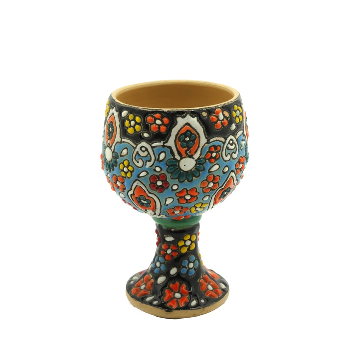 كأس سيراميكي زجاجي يدوي الصنع مع حامل - كأس مزخرف مطلي يدويًا، يُعد مثالًا رائعًا على الحرفية الراقية، حيث يمزج بين العملية والتصميم الخالد. صُنع هذا الكأس يدويًا بعناية فائقة على يد حرفيين مهرة، ويتميز ببطانة داخلية ناعمة بلون البيج، وسطح خارجي متعدد الألوان بتفاصيل بديعة، مزين بزخارف نباتية وهندسية متقنة بألوان الأزرق والأحمر والأصفر والأخضر والأبيض. قاعدة ساقه المرتفعة تُضفي عليه أناقة وثباتًا، مما يجعله مثاليًا كقطعة ديكور للعرض، أو كإكسسوار تقديم فريد، أو كهدية يدوية مميزة.