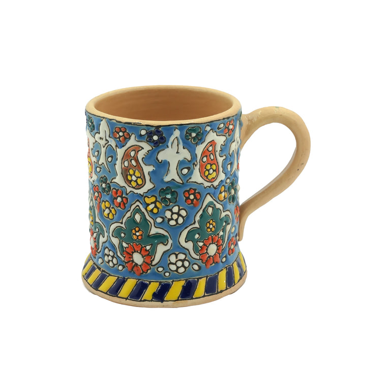 كوب سيراميك يدوي الصنع - كوب مزخرف مطلي يدويًا بقطر 9 سم، قطعة فنية رائعة تُضفي لمسةً من الرقي والأناقة على روتينك اليومي. صُنع هذا الكوب يدويًا على يد حرفيين مهرة، ويتميز ببطانة داخلية ناعمة بلون البيج، وسطح خارجي غني بالتفاصيل، مزين بزخارف نباتية وهندسية نابضة بالحياة مرسومة يدويًا بدرجات الأزرق والأصفر والأحمر والأخضر. يضمن مقبضه المتين استخدامًا مريحًا، بينما يُبرز اللمعان ملمسه وجمال تصميمه. مثالي للقهوة أو الشاي، أو كإضافة زخرفية ساحرة، فهو يعكس سحر فن الخزف اليدوي الخالد.