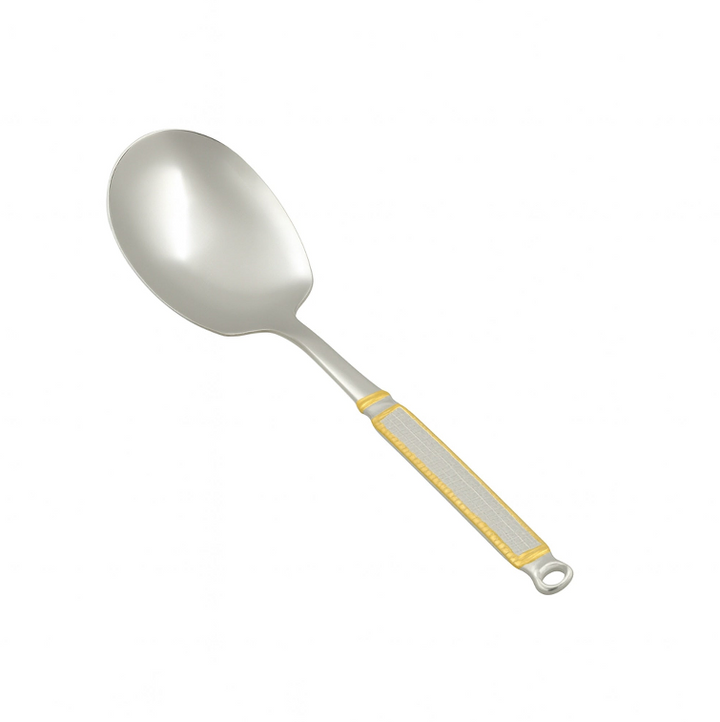 ملعقة الأرز المسطحة المصنوعة من الفولاذ المقاوم للصدأ CUT0010297 مصممة للطهي والتقديم اليومي بلمسة من الأناقة. تصميمها الفضي الأنيق ومقبضها الذهبي يجعلها عملية وأنيقة، مثالية للوجبات العائلية غير الرسمية والتجمعات الرسمية.