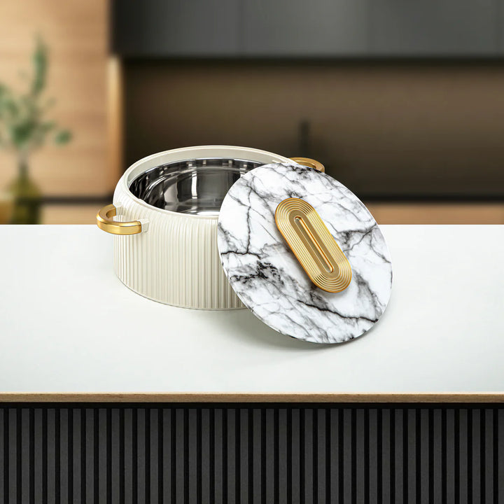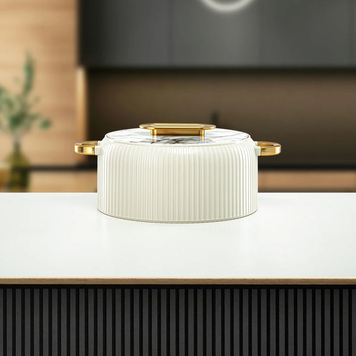 Elevate your dining experience with the EK-200/400/650 Hot Pot 3-Piece Set – White & Gold Finish, designed to combine timeless elegance with practical performance. The stunning white ribbed body paired with a marble-patterned lid and matte gold handles adds a touch of luxury to any table setting. Built with premium insulation and a stainless-steel interior, this set ensures your food stays warm, flavorful, and ready to serve.