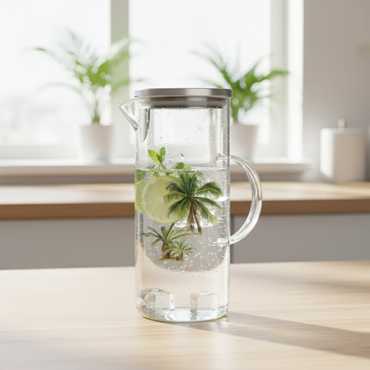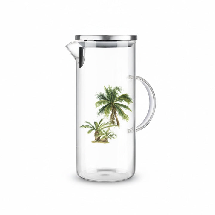 إبريق GLA27497 الزجاجي - سعة 1200 مل - مصنوع من زجاج البوروسيليكات المقاوم للحرارة مع غطاء من الفولاذ المقاوم للصدأ، يجمع بين الأناقة والعملية. مصنوع من زجاج البوروسيليكات المتين، ويتسع للمشروبات الساخنة والباردة بأمان، مما يجعله مثاليًا للشاي والقهوة والماء المنقوع والعصائر. تصميمه الأنيق بنقشة نخيل استوائية يضفي لمسة منعشة على سطح طاولتك، بينما يضمن غطاؤه المصنوع من الفولاذ المقاوم للصدأ سكبًا آمنًا وخاليًا من الانسكاب.
