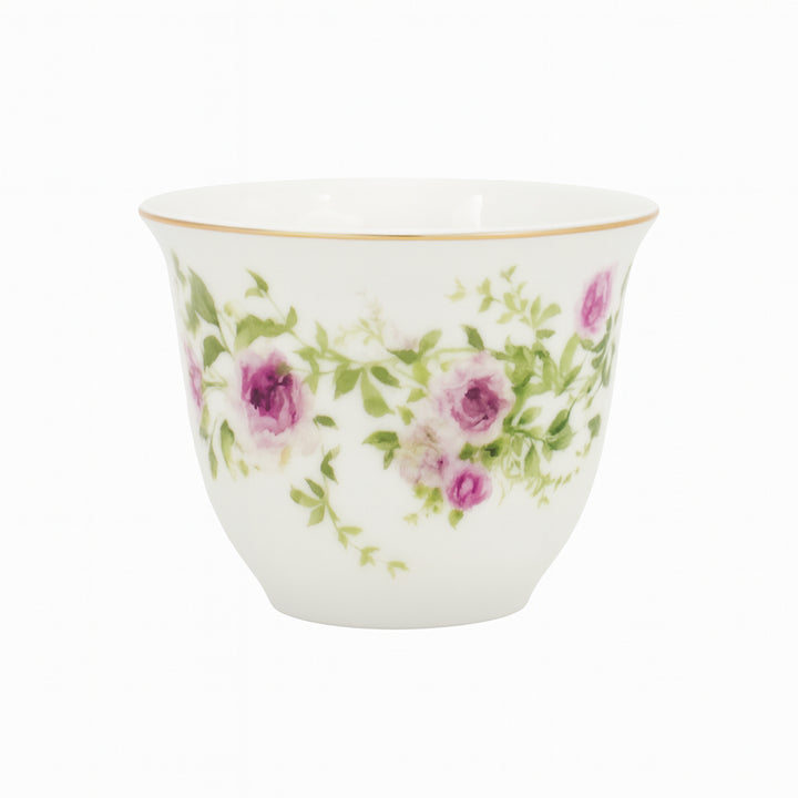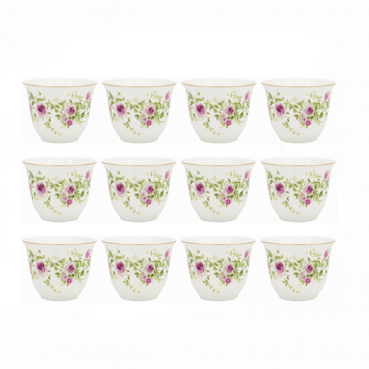 Serve Arabic coffee in style with the GP-82 Cawa Cup Set – 12-Piece – Purple Rose Floral Design with Gold Rim. Featuring a delicate rose pattern with soft purple tones and a fine gold rim, these cups bring a sense of charm and sophistication to your table. Perfect for family gatherings, special occasions, or everyday serving.