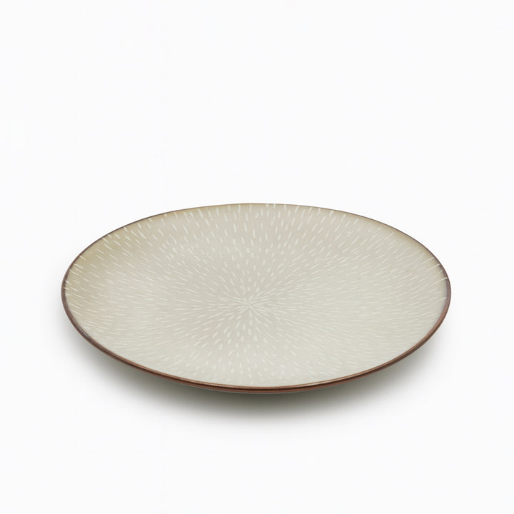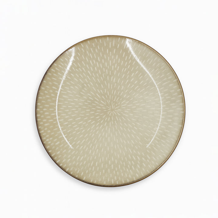 The HL707-2 Porcelain Salad Plate – 8.5" Round Plate in Textured Glossy Beige Finish is designed to bring sophistication and warmth to your dining experience. Crafted from high-quality porcelain, this plate features a beautiful textured surface with a subtle radial pattern, complemented by a glossy beige glaze and brown-edged rim for a refined, handcrafted look.