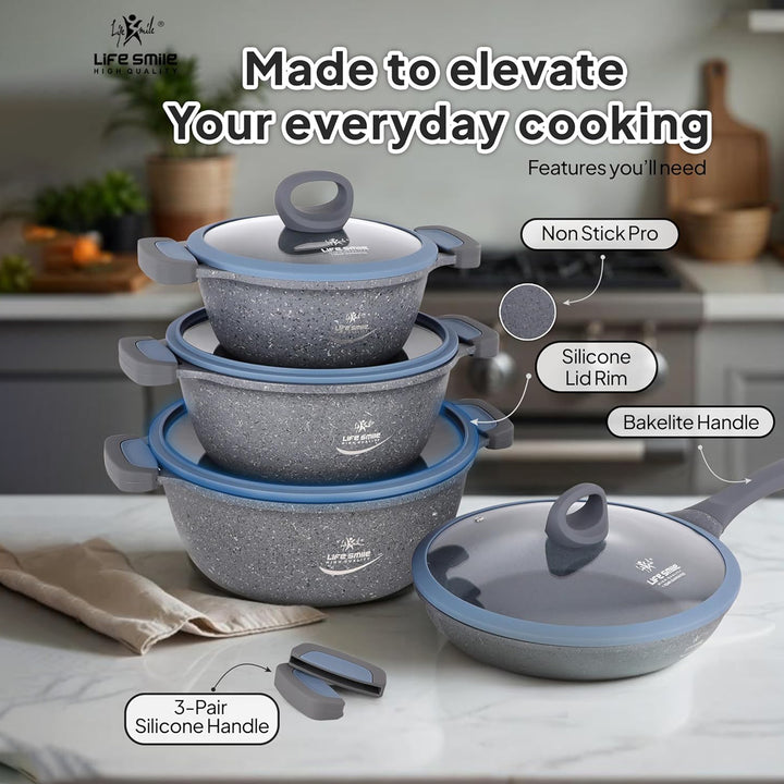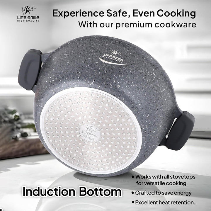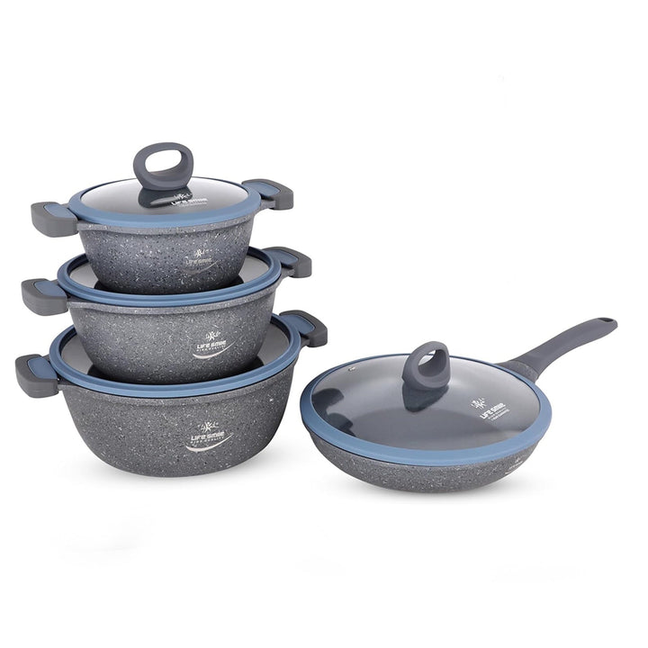طقم أواني الطهي LIFEP16-8 - 8 قطع من الجرانيت غير اللاصق بأغطية زجاجية - رمادي (سلسلة برج خليفة) مصمم للمطابخ العصرية التي تُقدّر الأناقة والأداء. مصنوع من طبقة جرانيتية تيتانيوم فاخرة غير لاصقة، مما يضمن طهيًا سهلًا، وتوزيعًا متساويًا للحرارة، ومتانة تدوم طويلًا. يُضفي لونه الرمادي الأنيق ومقابضه المريحة لمسةً من الأناقة والسهولة على كل وجبة.