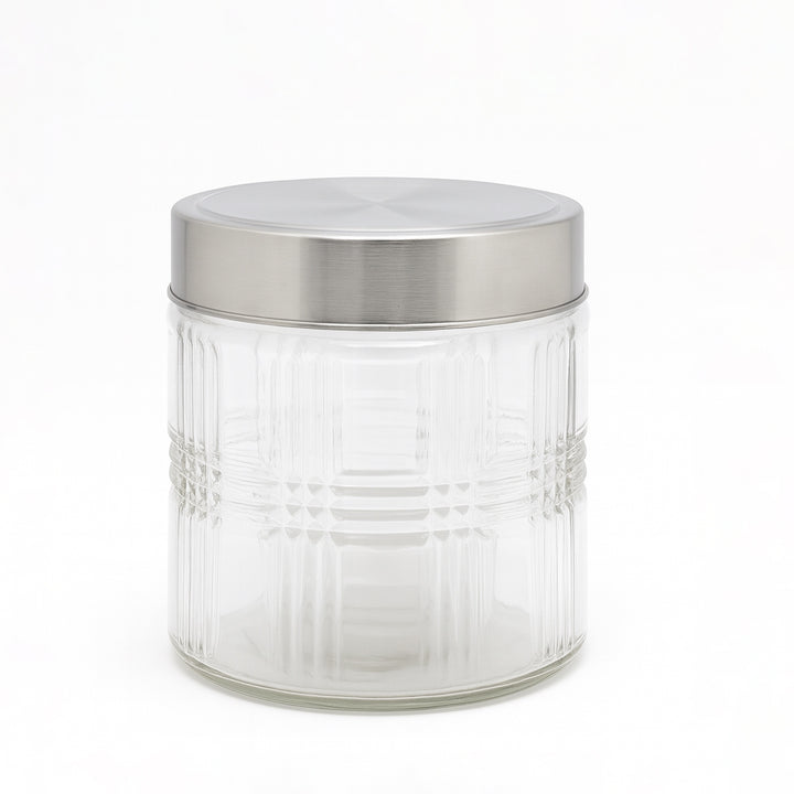 Organize your kitchen with the MARCH-0010 Glass Storage Jar with Silver Lid – 800 ml. Designed with a classic plaid-textured glass pattern and a sleek screw-on silver lid, this jar is ideal for storing tea, coffee, sugar, snacks, or dry fruits. Its compact size makes it perfect for countertops, shelves, and kitchen racks while adding a touch of elegance to your space.