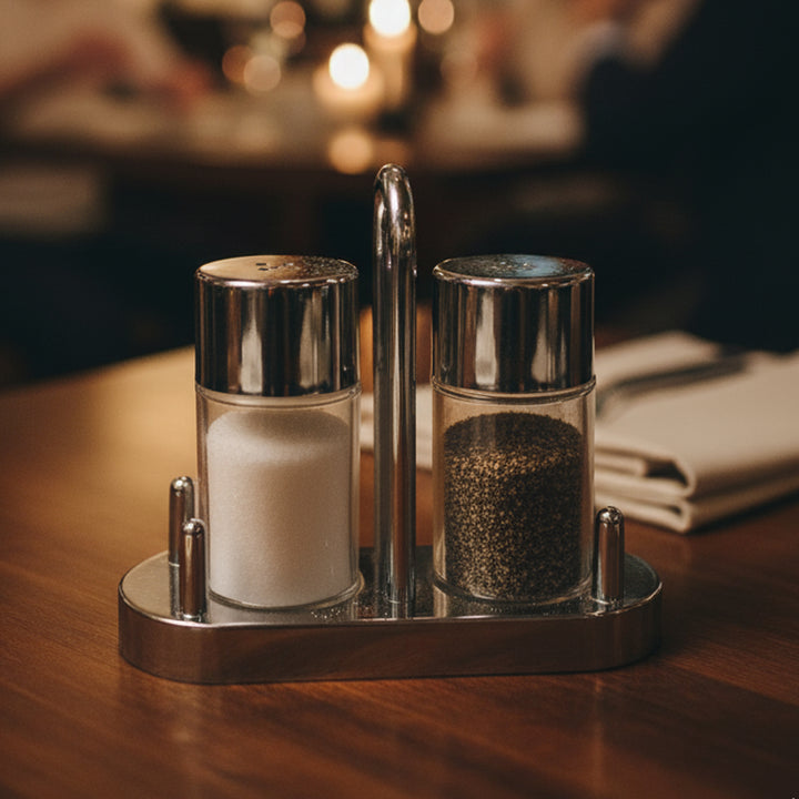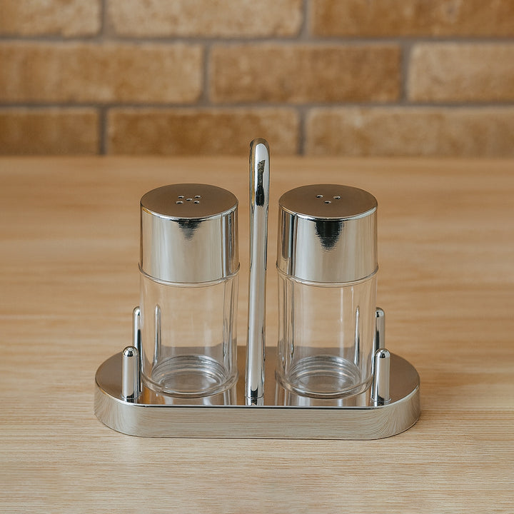 طقم ملح وفلفل أكريليك MRK77012 مع حامل يجمع بين التصميم الأنيق والعملية اليومية. مصنوع من أكريليك شفاف متين بلمسة نهائية فضية مصقولة، يضفي لمسة عصرية من الأناقة على تجربة تناول طعامك. هيكله الشفاف يُسهّل عليكِ تحديد محتوياته، بينما يُحافظ حامله الفضي المطابق على تنظيم كل شيء في متناول يدكِ.