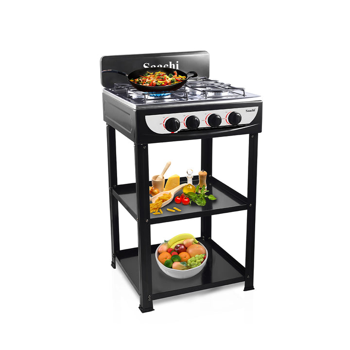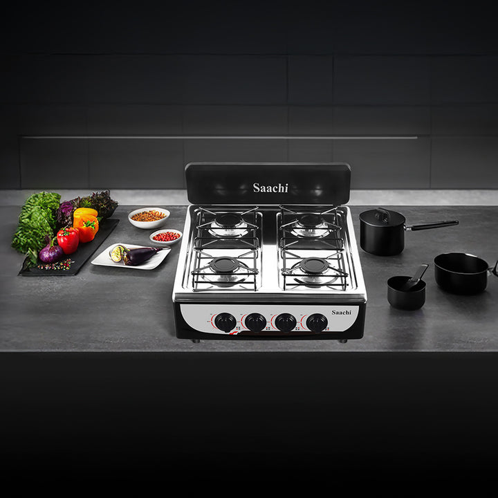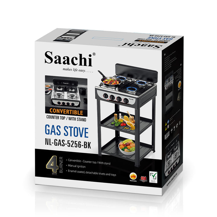 موقد غاز ساتشي NL-GAS-5256-BK بأربع شعلات - سطح طاولة قابل للتحويل مع حامل - أسود، مصمم لتوفير الراحة والمتانة والأداء القوي. مصمم بتركيب قابل للتحويل، يمكن استخدامه كموقد سطح طاولة أو مع حامله القابل للفصل لسهولة وضعه في أي مطبخ أو في الهواء الطلق. سطحه المطلي بالمينا، وصوانيه القابلة للفصل، وإشعاله اليدوي، تجعله أنيقًا وسهل الصيانة - مثاليًا للطهي اليومي أو للاستخدام في الهواء الطلق.