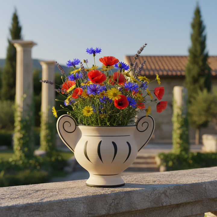 مزهرية الزهور الفنية NW240794L-BEBK ذات المقبضين المزدوجين، تُجسّد جمال التصميم اليوناني الروماني الخالد، بلمسة عصرية بسيطة. مصنوعة من سيراميك فاخر بلمسة نهائية بيج مطفية ناعمة، تتميز هذه النسخة الأكبر بخطوطها السوداء الجريئة المرسومة يدويًا وشكلها المنحوت. تتميز هذه المزهرية بمقبضين مزدوجين مزخرفين وقاعدة متوهجة على شكل قاعدة، مما يجعلها قطعة مركزية أو قطعة فنية مميزة على طاولات الكونسول أو رفوف المواقد أو الرفوف المفتوحة.