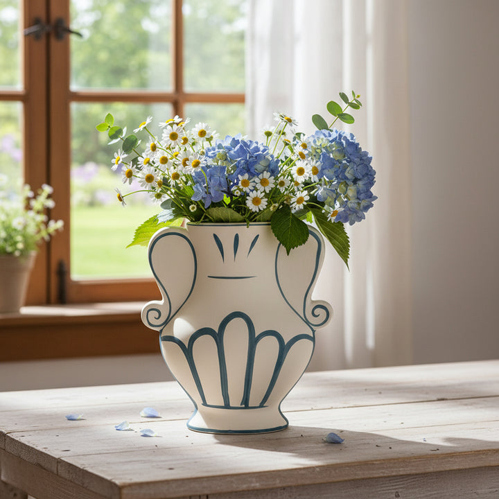 تُضفي مزهرية NW240795S-MWBL الفنية المنحنية ذات المقبضين لمسةً عصريةً من الجمال الكلاسيكي الحديث على الديكورات الداخلية العصرية. صُنعت هذه المزهرية من سيراميك عالي الجودة، وتتميز بجسم أبيض عاجي ناعم غير لامع، مع خطوط زرقاء رمادية مرسومة يدويًا، ومقابض منحوتة جريئة. يُضفي شكلها الدائري ومقابضها المتناسقة أناقةً تاريخية، بينما تُضفي لمساتها البسيطة سحرًا عصريًا ساحرًا.