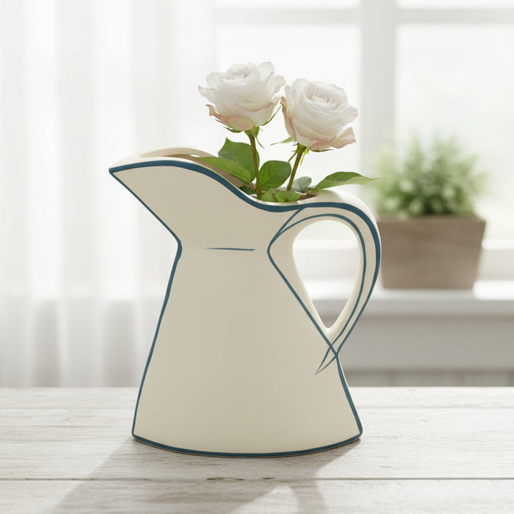 مزهرية الزهور الفنية NW240799S-MWBL على شكل إبريق تُحوّل ديكورك اليومي إلى قطعة فنية نحتية أنيقة. يبلغ ارتفاع هذه المزهرية 24 سم، بتصميمها الإبداعي الذي يُحاكي شكل إبريق كلاسيكي، مُعززة بخطوط زرقاء داكنة مرسومة يدويًا بأسلوب بسيط، تُبرز انحناءاتها بسحرٍ يُشبه رسمًا تخطيطيًا. مصنوعة من سيراميك فاخر بلمسة نهائية بيضاء غير لامعة، تُضفي لمسةً ساحرةً وراقيةً على أي طاولة أو رف.