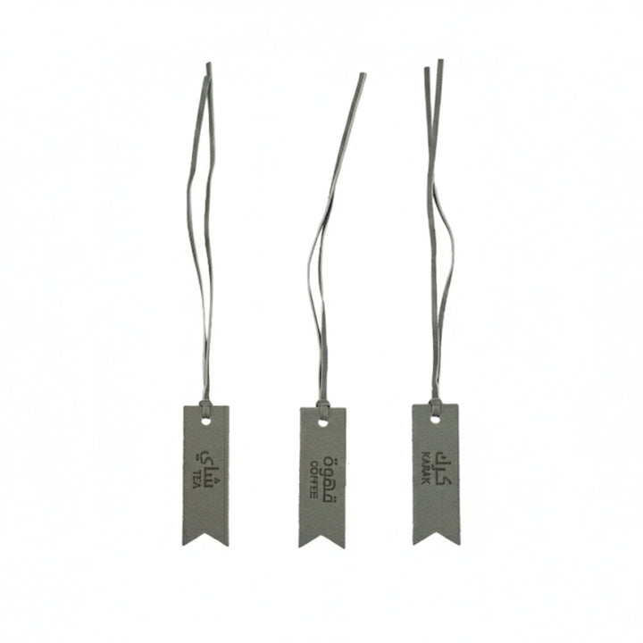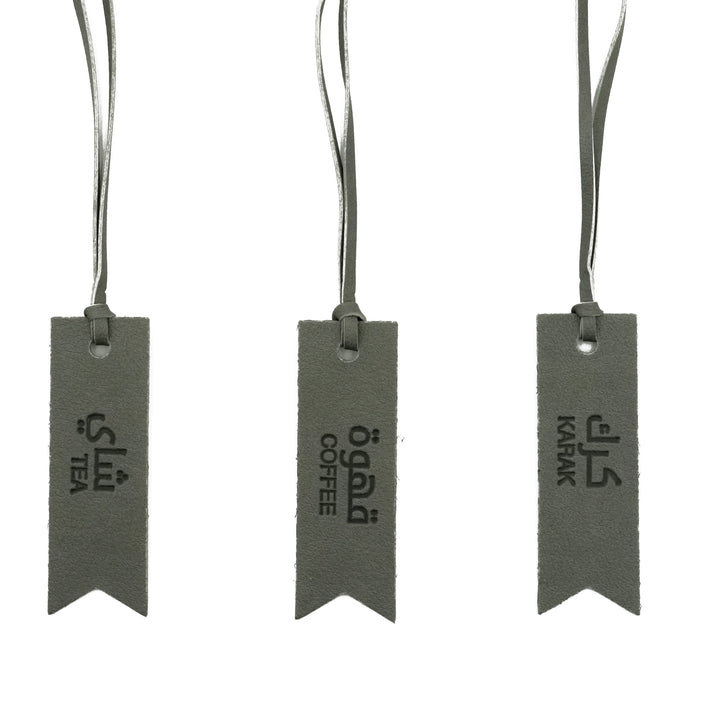 Bring a modern and stylish touch to your beverage service with the S-SE1022 Selsela Leather Flask Tag Set – 3-Piece – Gray. This set includes leather tags for Karak, Tea, and Coffee, crafted in a sleek gray finish with embossed Arabic and English text. These tags add elegance to your serving table while making it easy for guests to identify their favorite drinks.