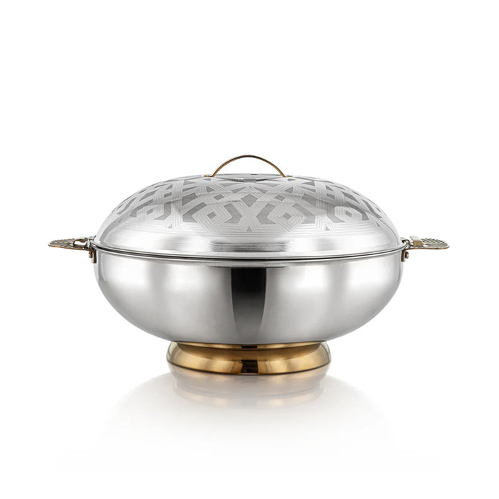 The STS0293107 Kanz Stainless Steel Hotpot – 12 Liter – Silver & Gold – H23E21HG is a luxury-grade insulated serving pot designed for large gatherings, premium presentations, and daily family hosting. Featuring a polished silver body with gold accents and an elegantly engraved dome lid, this hotpot adds a sophisticated touch to any dining table. Crafted from high-quality stainless steel and engineered with insulation, it keeps food hot for long durations while preserving flavor and freshness.