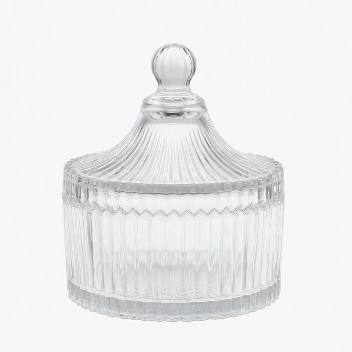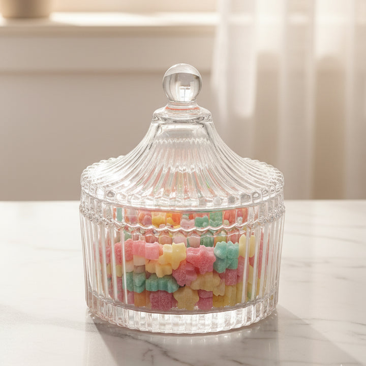 برطمان الحلوى الزجاجي 208-3/TG033/TG1032-4 من ديلي يجمع بين الأناقة الكلاسيكية والعملية. مصنوع من زجاج كريستالي شفاف فاخر، يتميز بملمس مضلع جميل وغطاء على شكل قبة يعلوه مقبض دائري لسهولة الاستخدام. بقطر 105 مم، يُعد هذا البرطمان مثاليًا لتخزين الحلوى والسكر والمكسرات أو الحلويات الصغيرة، مع إضافة لمسة من الرقي إلى سطح طاولتك أو طاولة القهوة. متين، مزخرف، وسهل التنظيف، إنه قطعة متعددة الاستخدامات تتماشى بسلاسة مع أي ديكور.