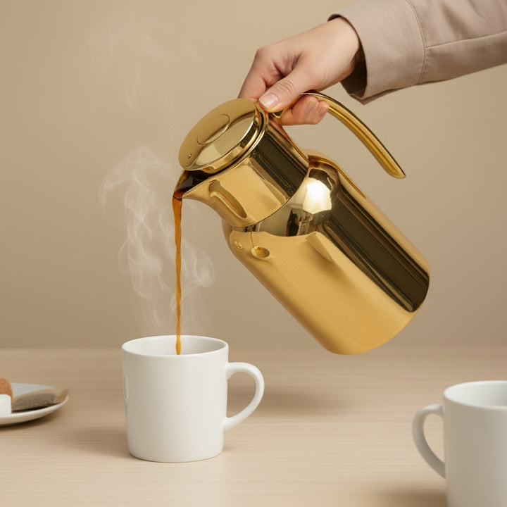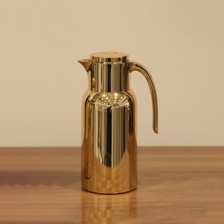 ترمس TSC12Q الفولاذي المفرغ من الهواء - سعة 1.3 لتر، بلمسة نهائية أنيقة بلون الشمبانيا الذهبي، مصمم ليجمع بين الرقي والأداء. مصنوع من فولاذ مقاوم للصدأ عالي الجودة بجدار مزدوج، ويوفر عزلًا حراريًا فائقًا للحفاظ على المشروبات ساخنة أو باردة لساعات. يُضفي مظهره الخارجي اللامع بلون الشمبانيا الذهبي، مع غطاء ومقبض من الكروم المصقول، لمسةً راقية على أي طاولة، مثالية للاستخدام في المنزل أو المكتب أو في أماكن الضيافة.