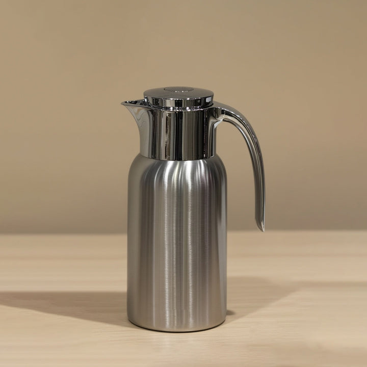 ترمس TSC12Q الفولاذي المفرغ من الهواء - سعة 1.3 لتر، بلمسة نهائية فضية مطفية عصرية، يجمع بين الأناقة البسيطة والعملية. مصنوع من فولاذ مقاوم للصدأ فاخر بتصميم جدار مزدوج مفرغ من الهواء، يحافظ على مشروباتك في درجة الحرارة المثالية - ساخنة أو باردة لساعات طويلة. هيكله الفضي المطفي الناعم، ومقبضه وغطاؤه المصنوعان من الكروم المصقول، يجعله إضافة راقية لأي طبق تقديم.