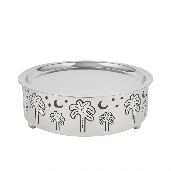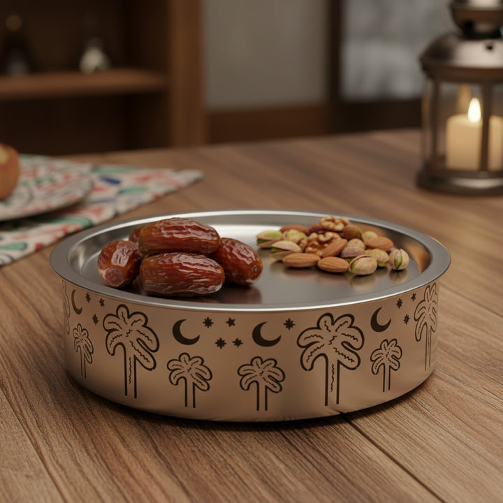The MD-1078C Serving Plate brings Middle Eastern artistry to your table. Crafted from premium stainless steel with a mirror-polished silver finish, it features beautifully engraved palm tree and crescent moon motifs — symbols of hospitality and tradition. Its wide, deep design makes it perfect for serving dates, sweets, nuts, or desserts, while the reflective surface adds a touch of sophistication to your gatherings, majlis settings, or festive celebrations.