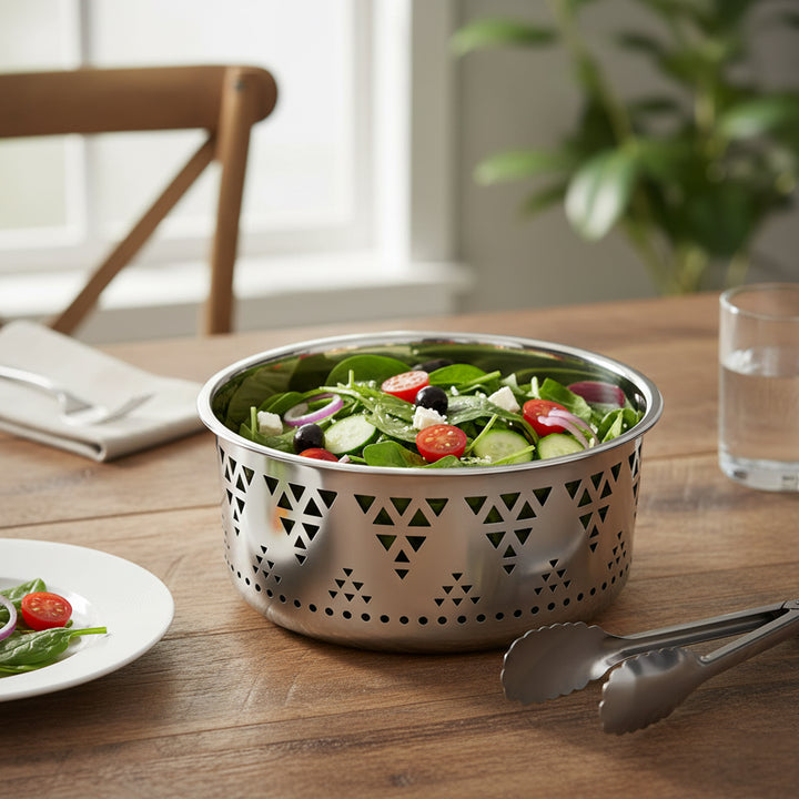 Elegant stainless steel salad bowl with modern geometric detailing
