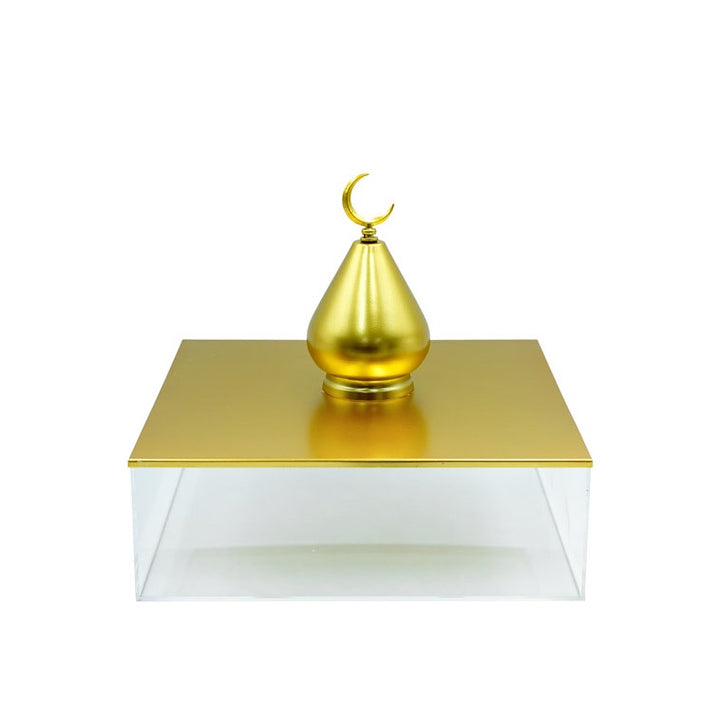 Elevate your festive decor with this exquisite gold box featuring a metal lid and an elegant minaret design. Measuring 30x30x10 cm, it offers ample space for storing treats, gifts, or keepsakes while adding a luxurious touch to your Ramadan celebrations