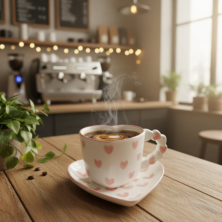 - Design: Heart-Shaped Cup, Handle & Saucer for a Romantic Look