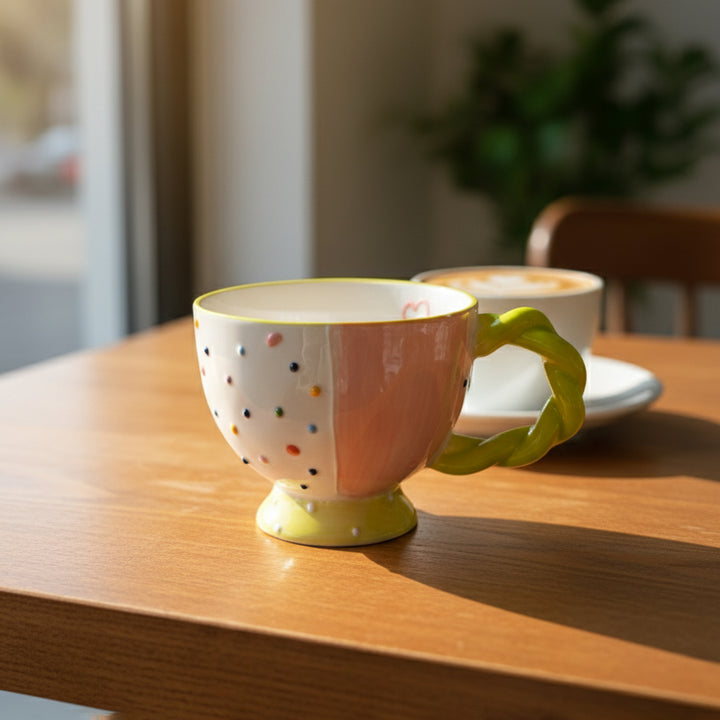 Playful Ceramic Cup with Polka Dot Pattern & Twisted Handle