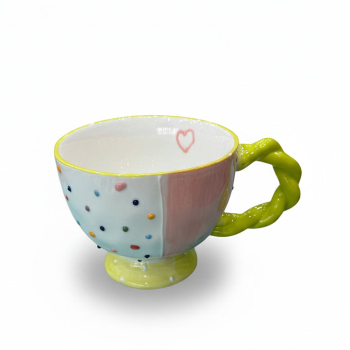 The 1515-07 Ceramic Cup brings a burst of color and cheer to your table with its white and pink finish, decorated with multicolor polka dots and a tiny heart detail inside the rim. The green twisted handle and yellow base add a fun contrast, making it a delightful addition to any serveware collection. Perfect for tea, coffee, or gifting, this cup combines creativity, comfort, and character in every sip.