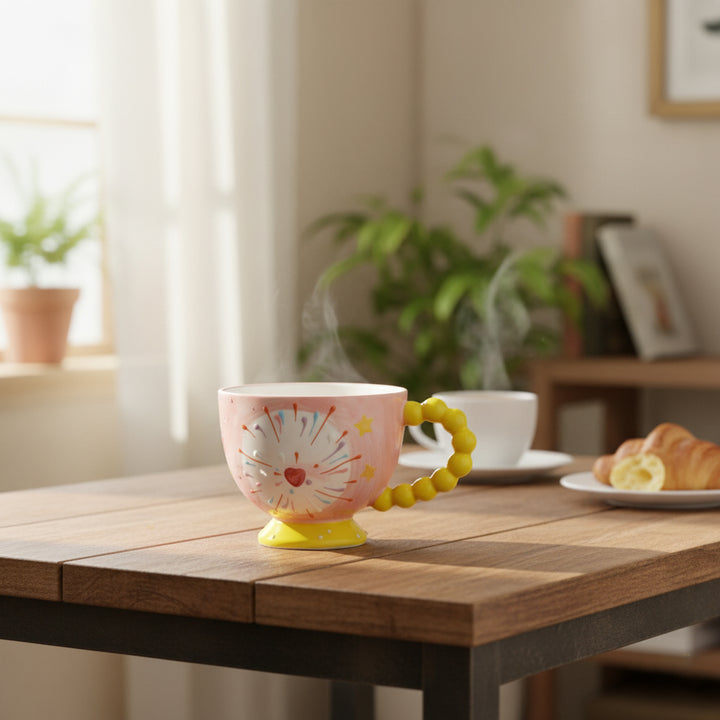 Playful Ceramic Cup with Multicolor Burst & Beaded Handle