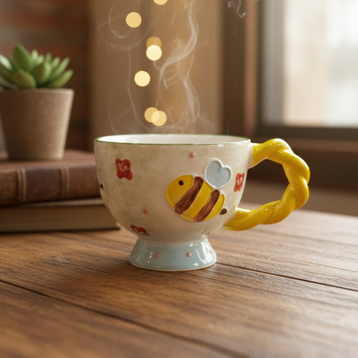Cheerful Ceramic Cup with Bee Motif & Twisted Handle