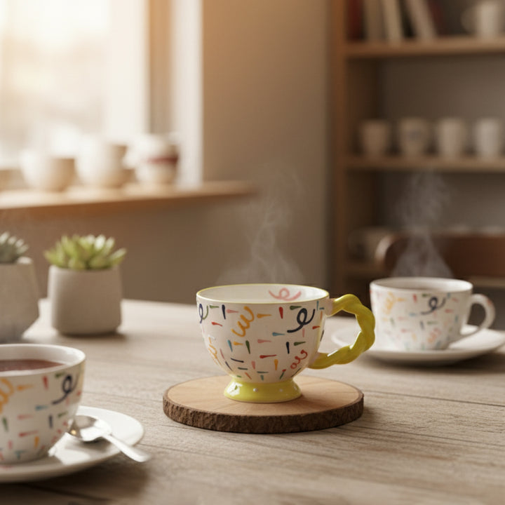 Playful Ceramic Cup with Multicolor Sprinkle Design & Twisted Handle