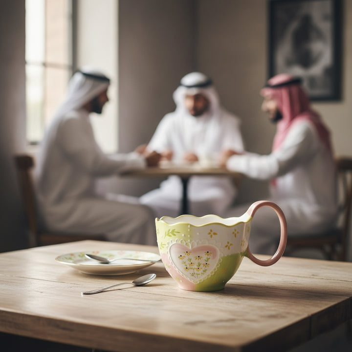 The 1520-12 Ceramic Cup – 12 cm (D) × 8 cm (H) – Yellow & Green Heart Floral Embossed Design with Pink Handle is a beautifully handcrafted piece that combines charm, color, and comfort. Its pastel tones and raised heart pattern make it perfect for adding a cheerful and artistic touch to your tea or coffee time.