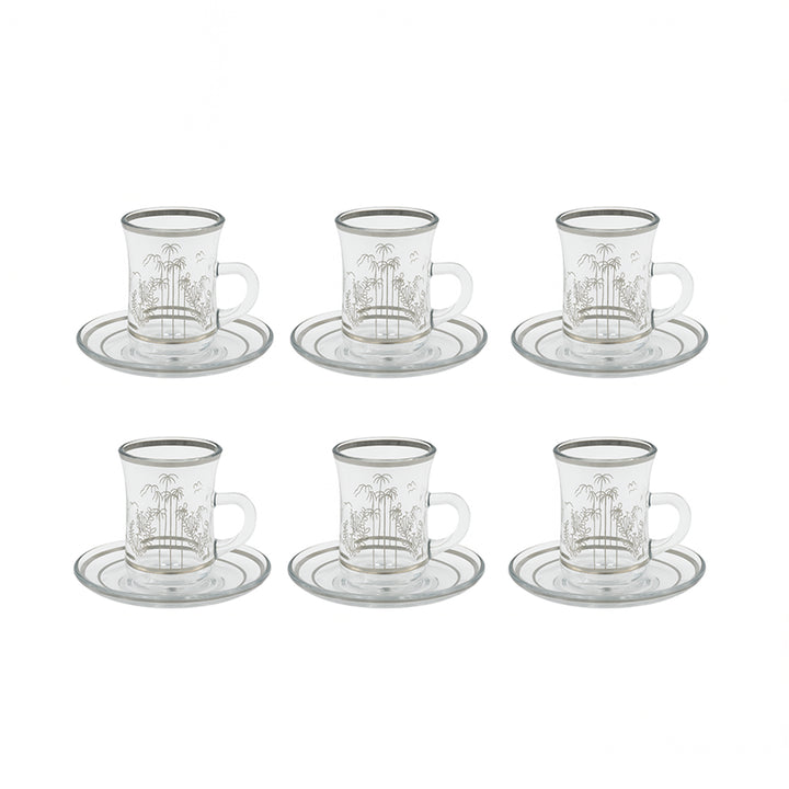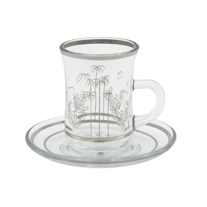 Serve your tea in style with the 1577S Glass Istekana Set – 12-Piece Elegant Tea Glass Set. Featuring a clear glass design with a refined silver rim and palm motif, this set is perfect for adding sophistication to any tea session, whether at home or for guests.