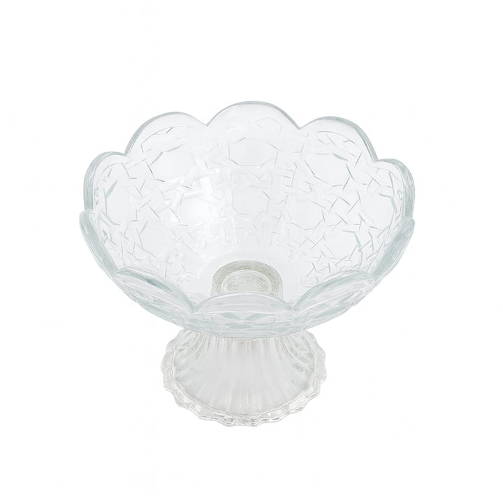 - Design: Crackle-Effect Textured Glass with Scalloped Edge and Sturdy Pedestal