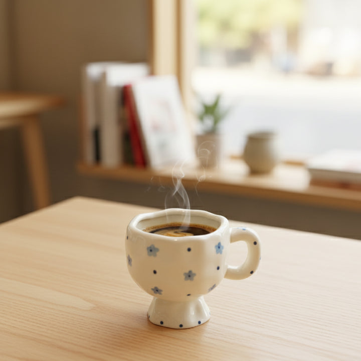 The 273-4 Ceramic Mug – 9 cm (D) – White Finish with Blue Floral Pattern Design combines charm and simplicity in one timeless piece. Featuring delicate hand-painted blue flowers over a creamy white base, this mug adds a touch of serenity to your coffee or tea moments. Its rounded, sculpted body and pedestal-style base create a cozy, artisan look that feels as good as it looks.