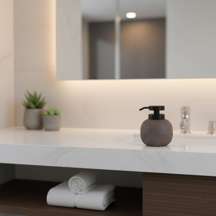 The 548-2 Soap Liquid Dispenser is designed to add both style and practicality to your space. Featuring a matte brown round body with a ribbed base and a sleek black pump, it’s perfect for dispensing liquid soap, hand lotion, or sanitizer. Its contemporary look makes it suitable for bathrooms, kitchens, and office wash areas.