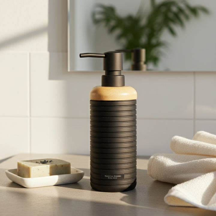 The 548-4 Soap Liquid Dispenser combines functionality with a stylish modern look. Featuring a matte black horizontal ribbed body paired with a natural wooden accent top, it brings elegance and practicality to bathrooms, kitchens, or office washrooms. Perfect for dispensing liquid soap, hand lotion, or sanitizer, this dispenser is designed for both daily use and decorative appeal.