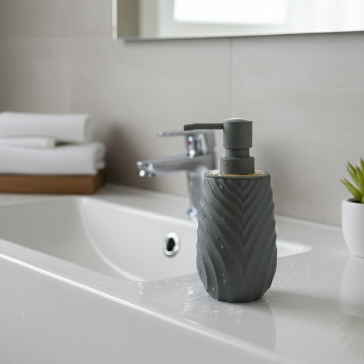 The 548-8 Soap Liquid Dispenser combines elegance and practicality with its dark grey leaf-textured body and wooden accent top. Designed for modern interiors, it is perfect for dispensing liquid soap, lotion, or sanitizer while adding a decorative touch to your bathroom, kitchen, or office washroom.