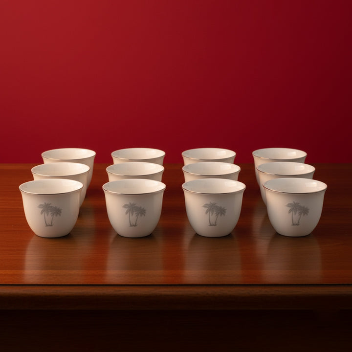 The 5795S Cawa Cup 12-Piece Set is a stunning blend of modern sophistication and traditional charm. Crafted from premium-quality ceramic, each cup features a graceful silver palm motif — symbolizing hospitality and serenity. The fine silver rim adds a refined accent, enhancing the clean white glaze for a timeless and luxurious look.
